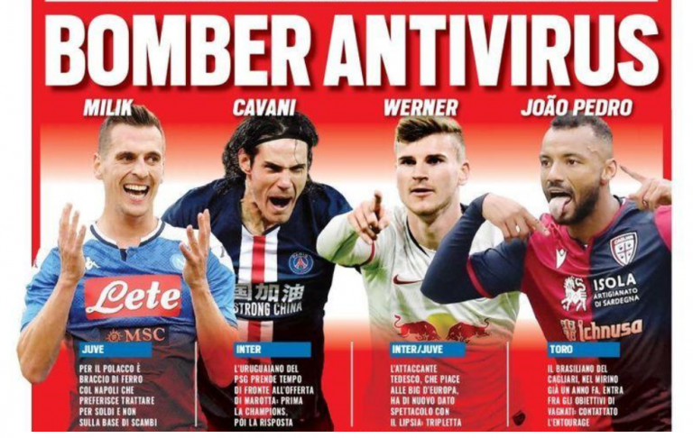 “Bomber antivirus”, scrive in prima pagina il quotidiano sportivo Tuttosport. Diversi i profili individuati come possibili nuovi arrivi in Serie A. Tra questi, anche Edinson Cavani, tentato dall’Inter in chiave mercato così come Timo Werner, protagonista con il Lipsia ed in un momento di forma strepitoso. Completano il poker da sogno Milik, nel mirino della Juventus, e Joao Pedro, tentato invece dal Cagliari.