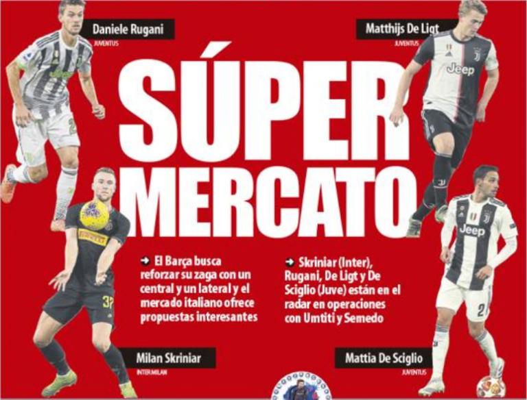 “Occasioni interessanti dall’Italia”, scrive il quotidiano in prima pagina che descrive il lavoro sul mercato del Barcellona, interessato ad un centrale difensivo e ad un esterno. Tra i nomi, insieme a quello di Skriniar anche i profili di Rugani, De Sciglio e De Ligt, tutti della Juventus. I blaugrana hanno occhi ovunque in chiave mercato ed osservano ogni possibile occasione per sfruttarla. Ma trattare nuovamente con l’Inter non sarà facile.