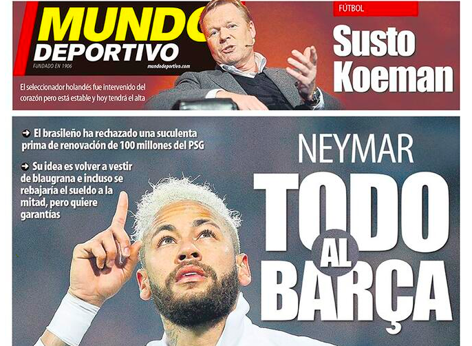 Neymar, che avrebbe già rifiutato un rinnovo dal valore complessivo di circa 100 milioni di euro proposto dal Paris Saint Germain, ha deciso di voler porre fine alla sua esperienza in Francia. Adesso il brasiliano attende un segnale forte dal Barcellona, perché – a parte la sua preferenza per i colori blaugrana – ha comunque bisogno di garanzie da parte del club. E, pur di tornare in Catalogna, dalla Spagna riferiscono che Neymar sarebbe disposto a dimezzarsi lo stipendio rispetto all’attuale somma percepita a Parigi.