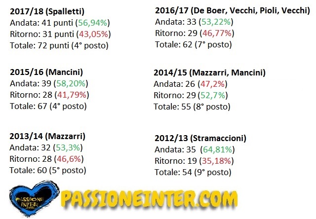 Una sola eccezione nella storia recente nerazzurra: nella stagione 2014/2015 furono 29 i punti conquistati nel girone di ritorno contro i 26 dell'andata