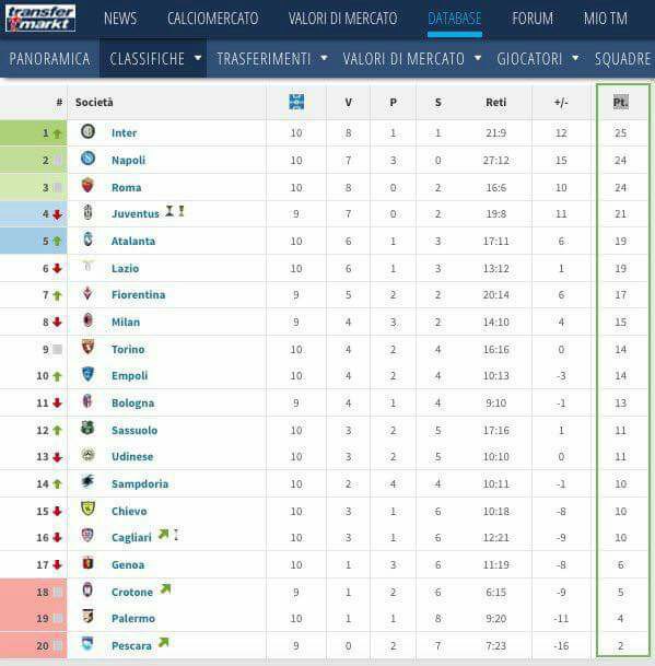 L’Inter guida la classifica con 25 punti (8 vittorie, 1 pareggio e 1 sconfitta), seguita da Napoli e Roma a quota 24. Nonostante le vittorie consecutive, però, i nerazzurri, come si nota dalla classifica, ha recuperato un solo punto sui partenopei e sui giallorossi: segno che il filotto deve proseguire per raggiungere un difficilissimo terzo posto.