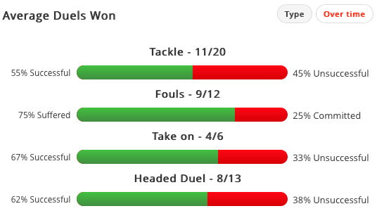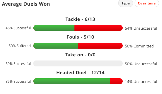 In ordine: scivolate (positive/negative), falli (fatti/subiti), uno contro uno (vinti/persi) e duelli aerei (vinti/persi).