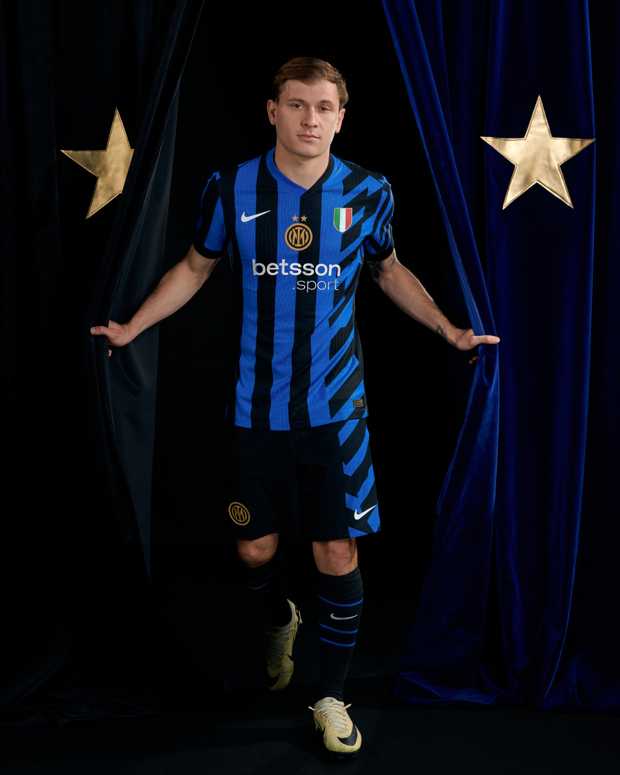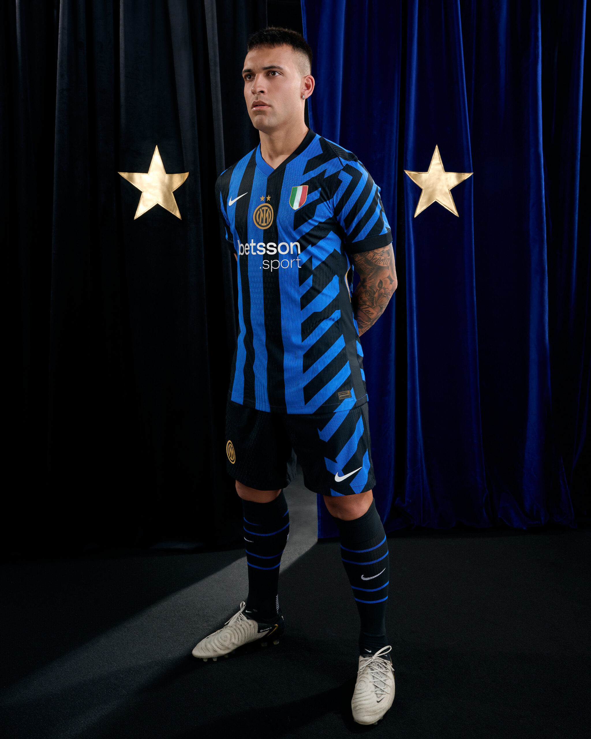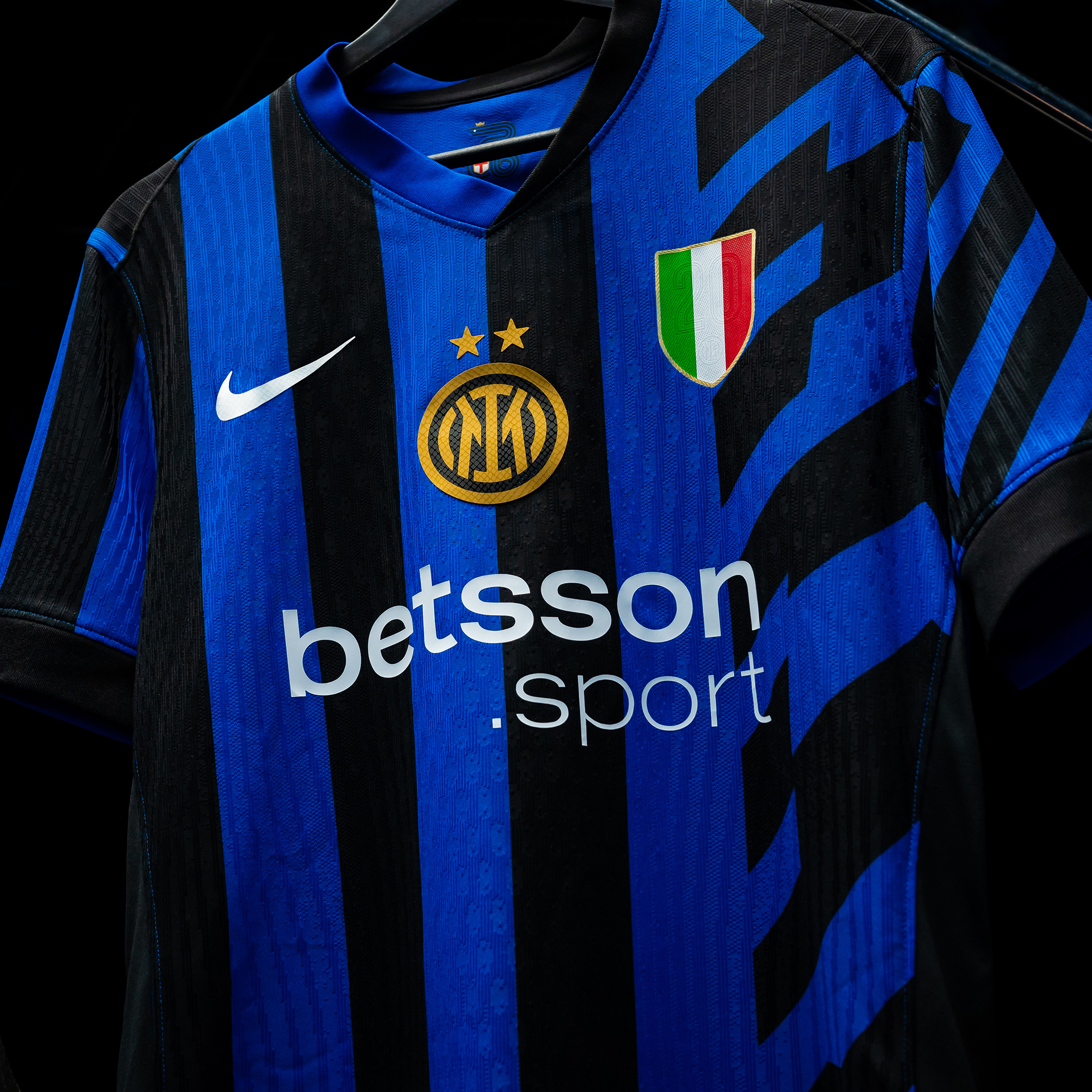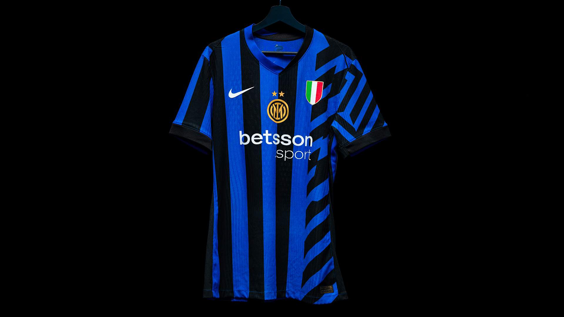 Il logo dell’Inter, per la prima volta nella versione con le due stelle, si trova cucito al centro della maglia, affiancato sul lato sinistro dal tricolore. Il front della maglia vede inoltre l’esordio di Betsson Sport, nuovo Official Main Partner, mentre sul retro prosegue la collaborazione con U-Power, Official Back Jersey Partner del Club.