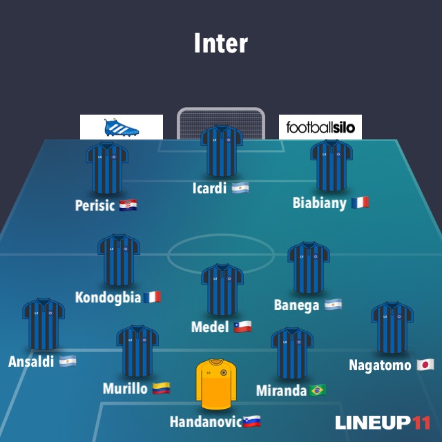 INTER (4-3-3) – Handanovic; Nagatomo, Miranda, Murillo, Ansaldi; Banega, Medel, Kondogbia; Perisic, Icardi, Biabiany.