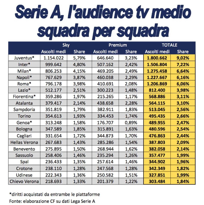 Secondo quanto riporta il sito di Calcio & Finanza infatti, i nerazzurri hanno avuto una media di 1.506.804 ascolti, per uno share di 7,22% a partita, considerando i numeri fatti registrare da Sky e Premium (999.642 la prima, 507.162 la seconda). La squadra di Spalletti si è posizionata seconda dietro solo alla Juventus in questa speciale classifica, con i bianconeri capaci di far registrare una media di ascolti pari a 1.800.662, per uno share di 9,2%.