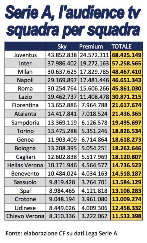 C&F – Spettatori in TV della Serie A 2017/18: Inter seconda solo alla Juventus, Milan staccato