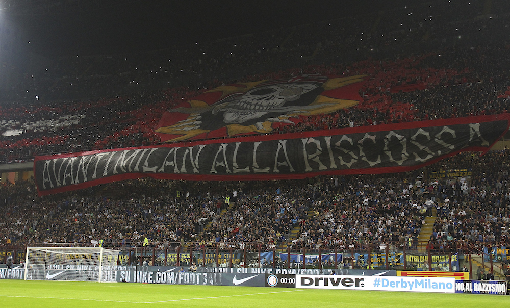 Dal secondo anello blu è arrivata la risposta dei cugini rossoneri. Il motivo di base appare simile, con i colori sociali sullo sfondo e, al centro della composizione, un teschio con in bocca un coltello, che ben si sposa con la scritta: “Avanti Milan, alla riscossa!“. Come si può ben vedere, confrontando le due fotografie, il confronto premia i nerazzurri, autori di una coreografia più omogenea e piacevole agli occhi. Perchè il Derby si gioca anche (appena) fuori dal campo…