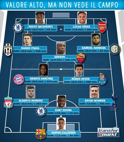 Questa la formazione completa della Top 11 dei calciatori che valgono tanto, ma giocano poco. In porta Cillessen, in difesa spazio a Wimmer, Zouma e Moreno. A centrocampo Neves e Sanches. Alle spalle di Batshuayi e Perez, il trio delle squadre italiane Gabigol, Gerson e Pjaca.