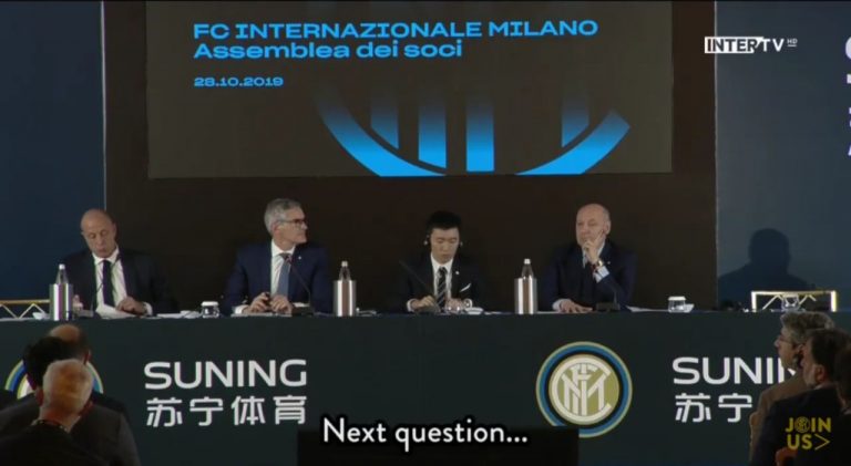 Il discorso del presidente: ”Siamo qui per parlare del percorso iniziato 3 anni fa. L’obiettivo è lo stesso, vogliamo puntare al massimo in campo. Oggi siamo qui a costruire un club solido, sulle fondamenta sulle quali lavoriamo dal 2016. Noi lavoriamo e costruiamo per il lungo termine, noi guardiamo a questo club da un punto di vista completamente diverso perché la situazione è chiamato. Con gli sforzi di ognuno in noi questo club ha cambiato il proprio destino. Per far si che il club cresca, dobbiamo prestare attenzione alle nuove generazioni e ai nostri tifosi. Oggi il successo non dipende dai 90 minuti, ogni attività e ogni iniziativa del club influenza la nostra performance. Siamo diventati un’azienda che coinvolge le persone a 360°, con dimensioni mondiali. Dobbiamo fare in modo di coinvolgere anche chi è lontano da questo sport, con contributi in digitale da condividere con un pubblico che probabilmente non aveva mai prestato attenzione ai nostri contributi prima. Questo settore punta a mercati globali e anche noi come Inter dobbiamo riconoscere sempre più l’interesse del calcio nel mondo cercando nuovi partner e nuovo pubblico”.