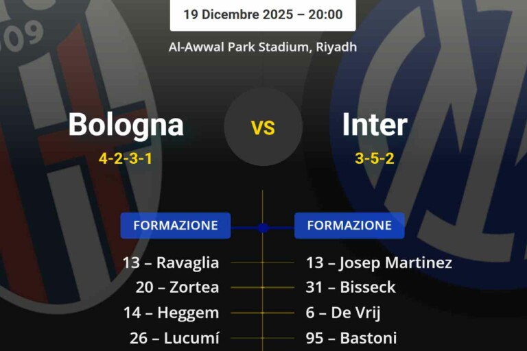 Sarà la seconda semifinale di Supercoppa Italiana quella tra Bologna-Inter in programma venerdì 19 dicembre alle ore 20.00. Allo stadio Al-Awwal Park di Riyadh, le due formazioni allenate da Vincenzo Italiano e Cristian Chivu si giocheranno in gara singola il passaggio diretto alla finalissima contro il Napoli, reduce dalla vittoria di ieri sera nell’altra semifinale sul Milan. (ECCO DOVE VEDERE BOLOGNA-INTER).