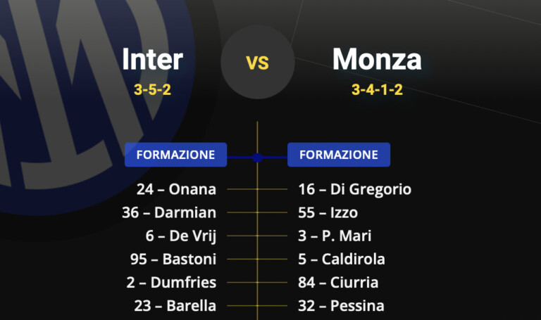 In vista del ritorno europeo alle porte (in programma mercoledì sera), Inzaghi è pronto a far riposare alcuni uomini chiave del suo scacchiere come Acerbi e Mkhitaryan, rimpiazzandoli con De Vrij e Gagliardini. Sempre in ottica turnover, restano fuori Lautaro e Dzeko (un segnale su chi sarà titolare nella sfida di Champions?) e giocano dall’inizio Lukaku e Correa, come accaduto con la Salernitana. Mentre sulla fascia sinistra ritrova spazio Gosens, dopo il gol all’Arechi ed essere subentrato con il Benfica. Nella linea di centrocampo diversi dubbi da sciogliere, con Asllani che prende quota e Calhanoglu verso il ritorno in panchina dopo l’infortunio. Ecco le probabili formazioni delle due squadre.