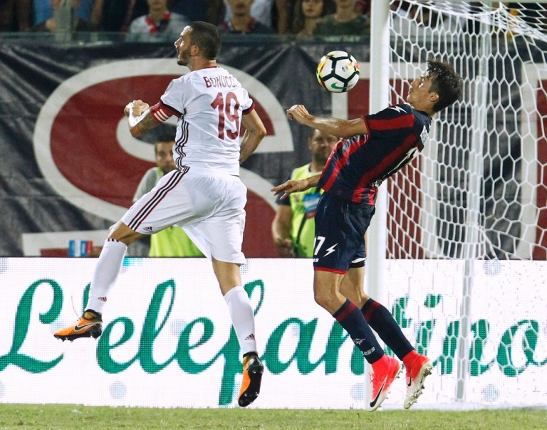 Crotone's Croatian forward Ante Budimir (R) vies for the ball with Milan's Italian defender Leonardo Bonucci during the Italian Serie A football match FC Crotone vs AC Milan on August 20 2017 at the Ezio Scida Stadium. / AFP PHOTO / CARLO HERMANN (Photo credit should read CARLO HERMANN/AFP/Getty Images)