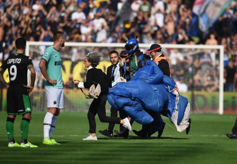 Sassuolo-Inter, imprevisto al Mapei Stadium: un paracadutista atterra in campo dal cielo!