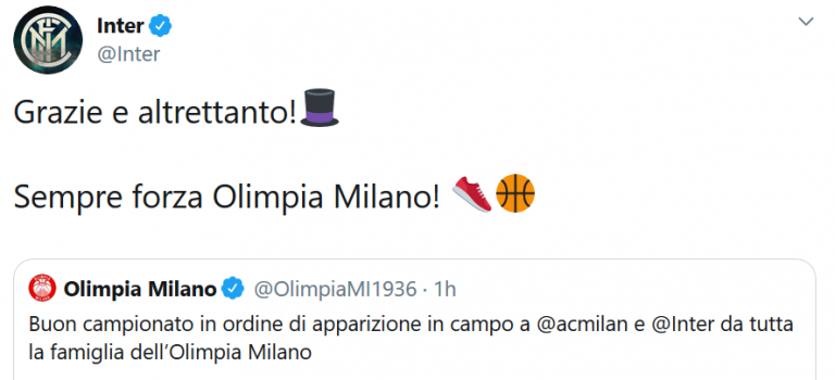 Social – L’Olimpia Milano augura buon campionato ai club meneghini. E l’Inter ringrazia