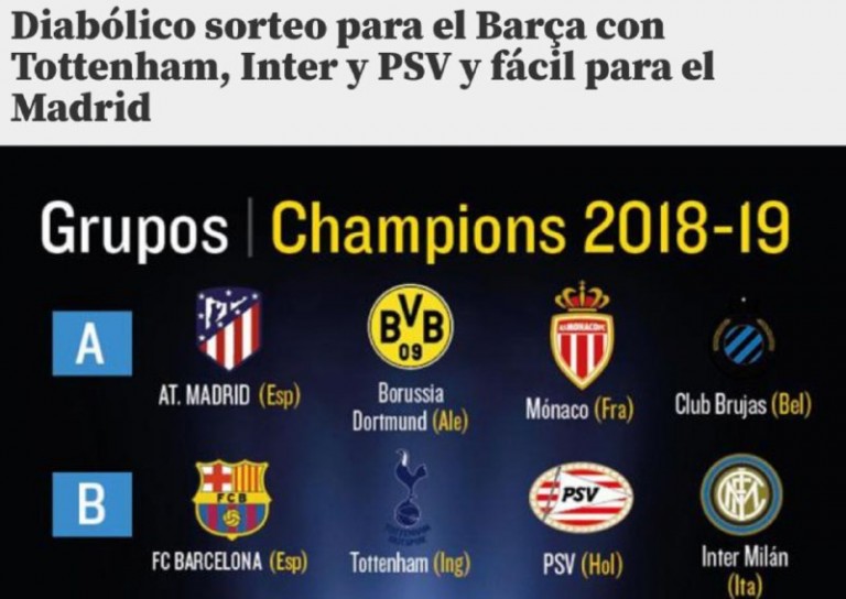 E’ un eufemismo dire che poteva andare decisamente meglio all’Inter di Spalletti il sorteggio avvenuto questa sera a Montecarlo in vista dell’edizione 2018/19 della Champions League: sono il Barcellona, il Tottenham ed il Psv le squadre che i nerazzurri dovranno fronteggiare per approdare agli ottavi di finale. Se a Milano non possono essere contenti, lo stesso si può vedere anche per le avversarie, così come testimoniano le aperture dei siti di giornali spagnoli, inglesi ed olandesi.