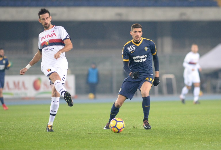VERONA, ITALY - DECEMBER 04: Mattia Vallotti (R) of Hellas Verona competes with Nicolas Spolli of Genoa CFC during the Serie A match between Hellas Verona FC and Genoa CFC at Stadio Marc'Antonio Bentegodi on December 4, 2017 in Verona, Italy. (Photo by Dino Panato/Getty Images)