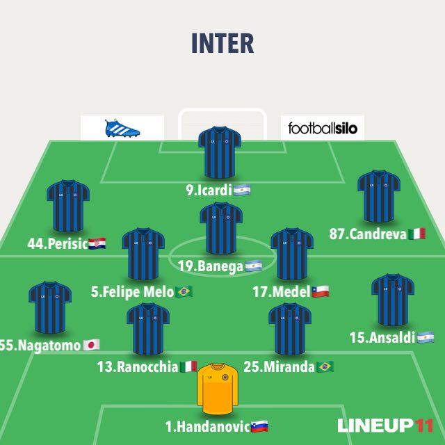 INTER (4-4-1-1): Handanovic; Ansaldi, Miranda, Ranocchia, Nagatomo; Candreva, Medel, Melo, Perisic; Banega; Icardi. All.: Vecchi