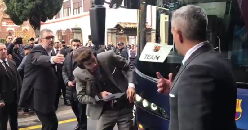 Appena sceso dal pullman però, ecco una brutta sorpresa per il difensore Gerard Piqué: la sua concentrazione è tutta rivolta allo smartphone, così si rende protagonista di un esilarante botto contro lo specchietto del mezzo societario, fra le risate dei tifosi presenti.